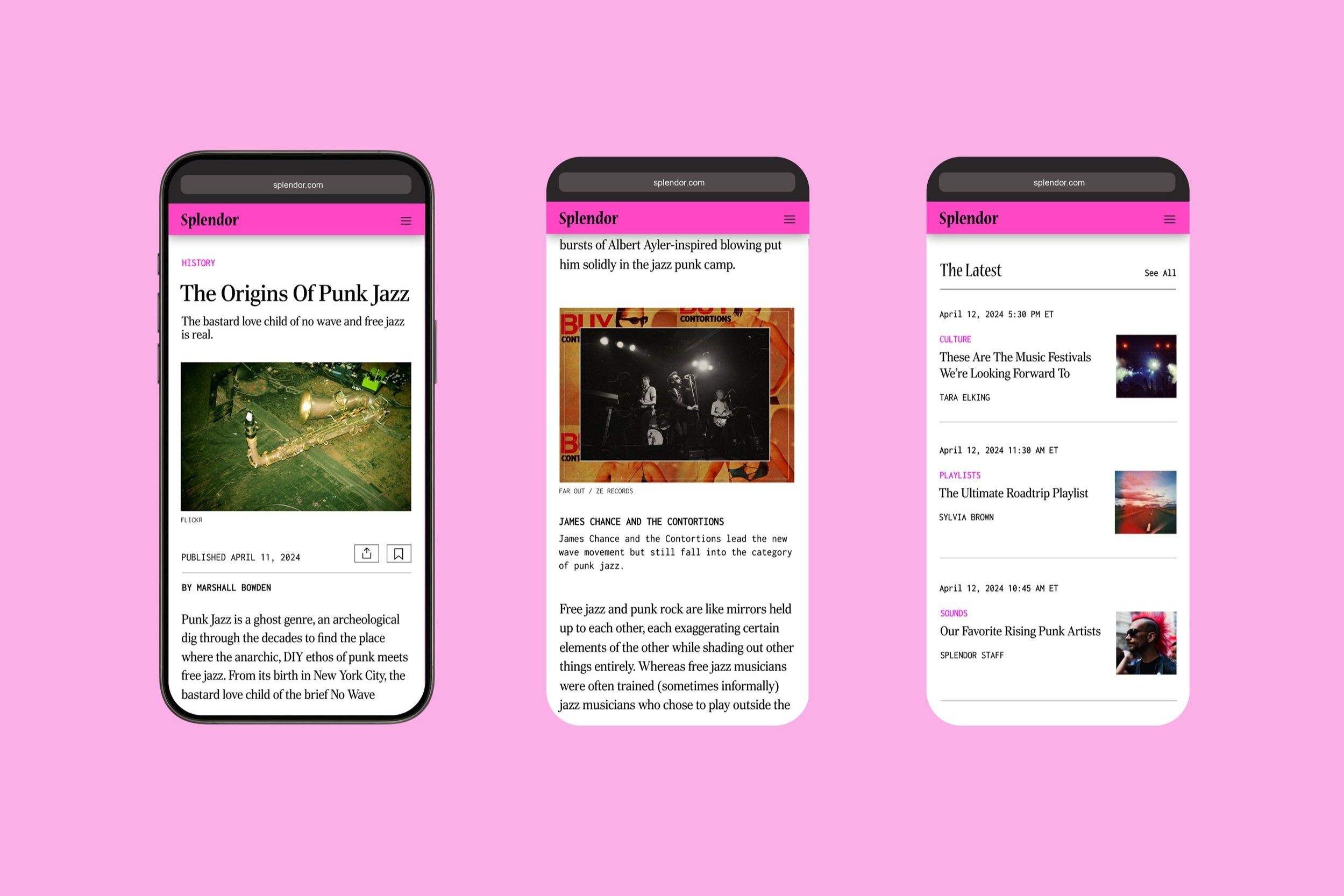 Project Brief: Splendor is a digital publication that believes in the magic of music, the distinctive voice, and the power of music to influence and shape culture. Primarily focusing on indie and alternative music through a variety of genres, Splendor shares and discusses music, shines a spotlight on rising artists, and furthers conversation around the impact of music as well as the rich history of indie, alternative, and lesser known sub-genres. The task was to design a website and create a visual language that was authentic to Splendor. Splendor’s visual language is inspired by the dynamic energy of the music scene. The design is trendy, fun, and energetic while still maintaining sophistication and user-friendly systems. Designs were created for both desktop and mobile. They include designs for the homepage, a section landing page, an article page, and an editorial feature.